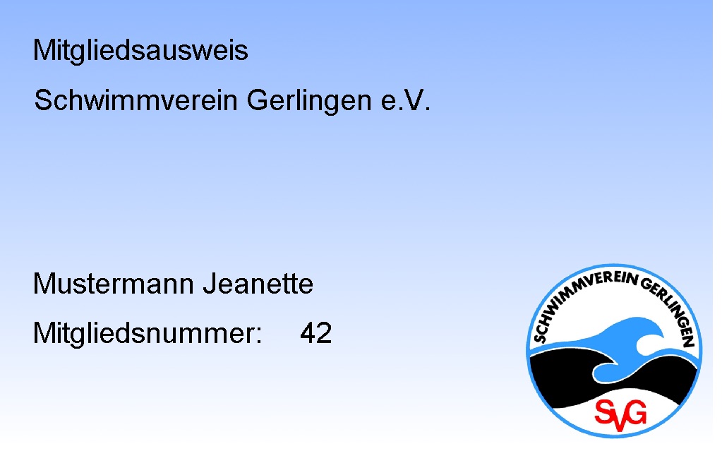 Jedes Mitglied erhält den Schwimmverein Gerlingen – Mitgliedsausweis. Dies ist eine Karte in der Größe einer Scheckkarte, mit Ihrem Namen und Ihrer Mitgliedsnummer. Mit dem Mitgliedsausweis können Sie sich gegenüber der Eingangskontrolle ausweisen. Wir bitten Sie, bzw. Ihr Kind, diesen Ausweis immer mit sich zu führen und am Eingang des Hallenbades vorzuzeigen.
